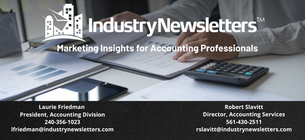 Thank you for your interest! Once a month, IndustryNewsletters will send you an email newsletter on behalf of Laurie Friedman and Robert Slavitt so you can learn about us, our staff, and many tips, trends and issues surrounding accounting firm marketing. You can unsubscribe at any time, and we never share, sell or otherwise reuse your contact information. The goal of our newsletter is to inform you about marketing trends and provide you with the resources that will help you improve your strategies. We hope you enjoy our newsletter!